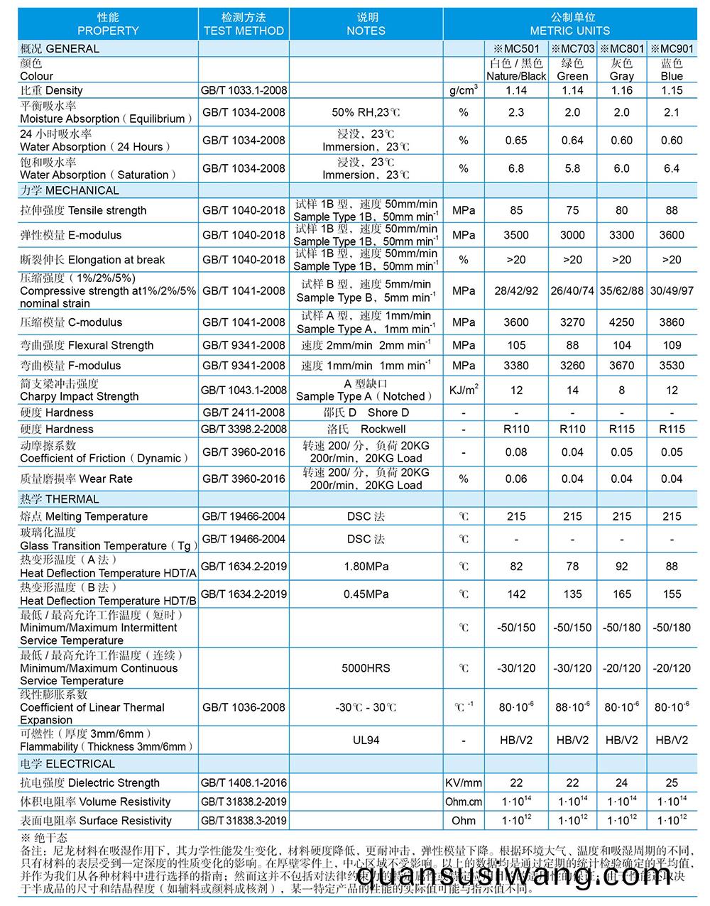 ●MC501 ( 象牙白/黑色) :未改性的澆(jiao)鑄尼龍,具有良好的強度、剛性、硬度(du)以及(ji)尺寸穩定性;滑動性能優異,加工性(xing)能較好。